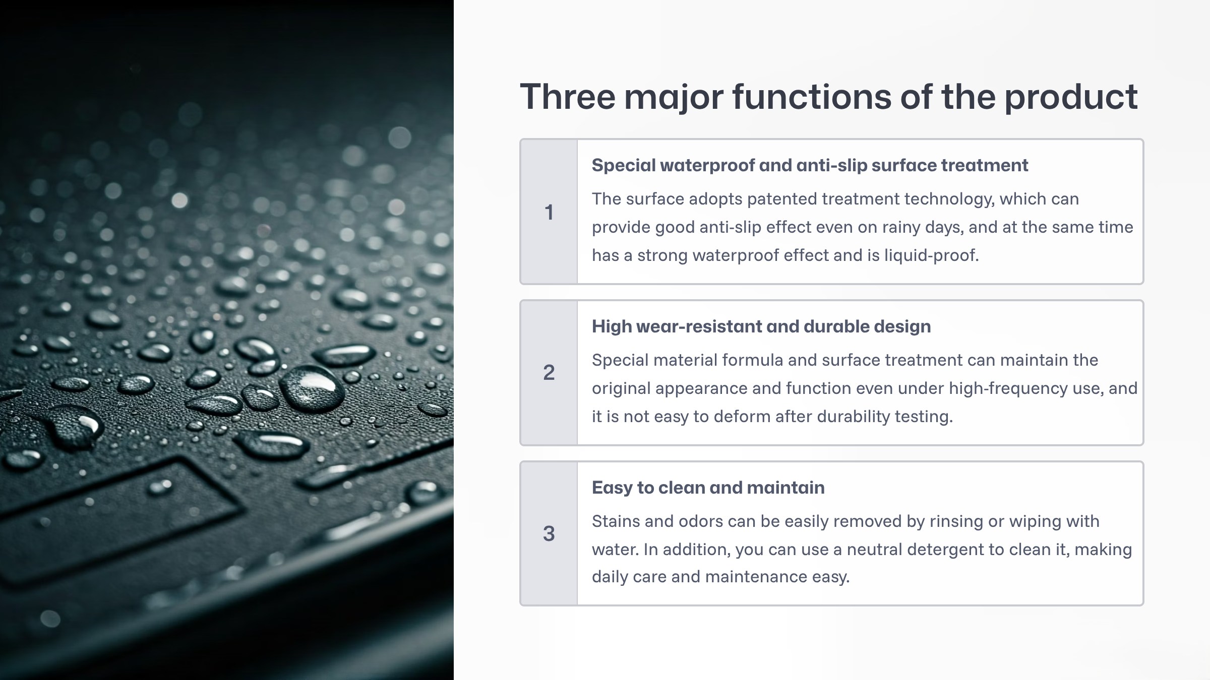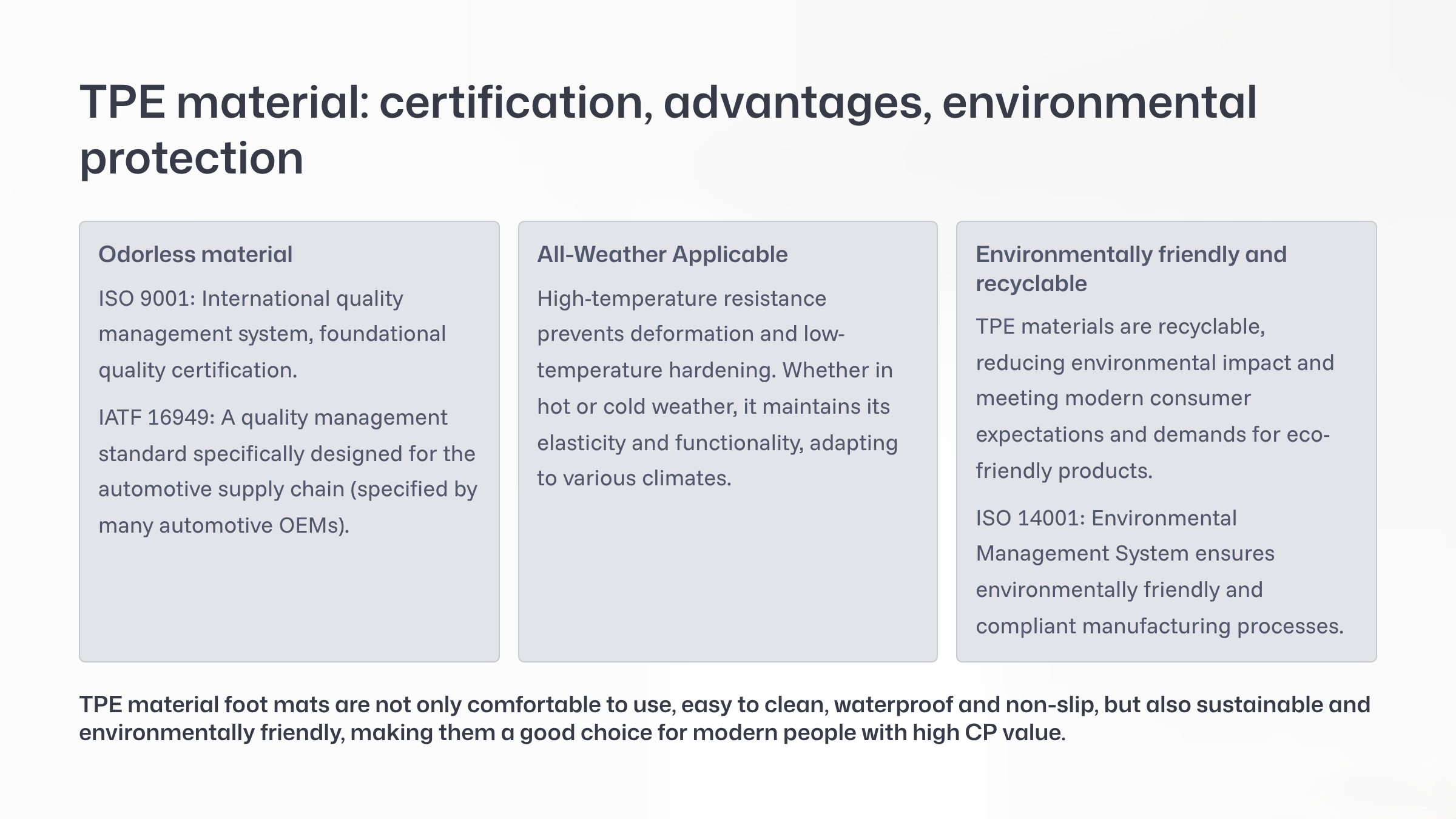 Our premium floor mats not only deliver a refined look that seamlessly blends with any vehicle interior, but also provide practical benefits such as raised-edge 3D protection, lightweight durability, waterproofing, anti-slip safety, and wear resistance. Committed to sustainable environmental practices, we focus on delivering high-value, eco-friendly products that meet the needs of global markets.