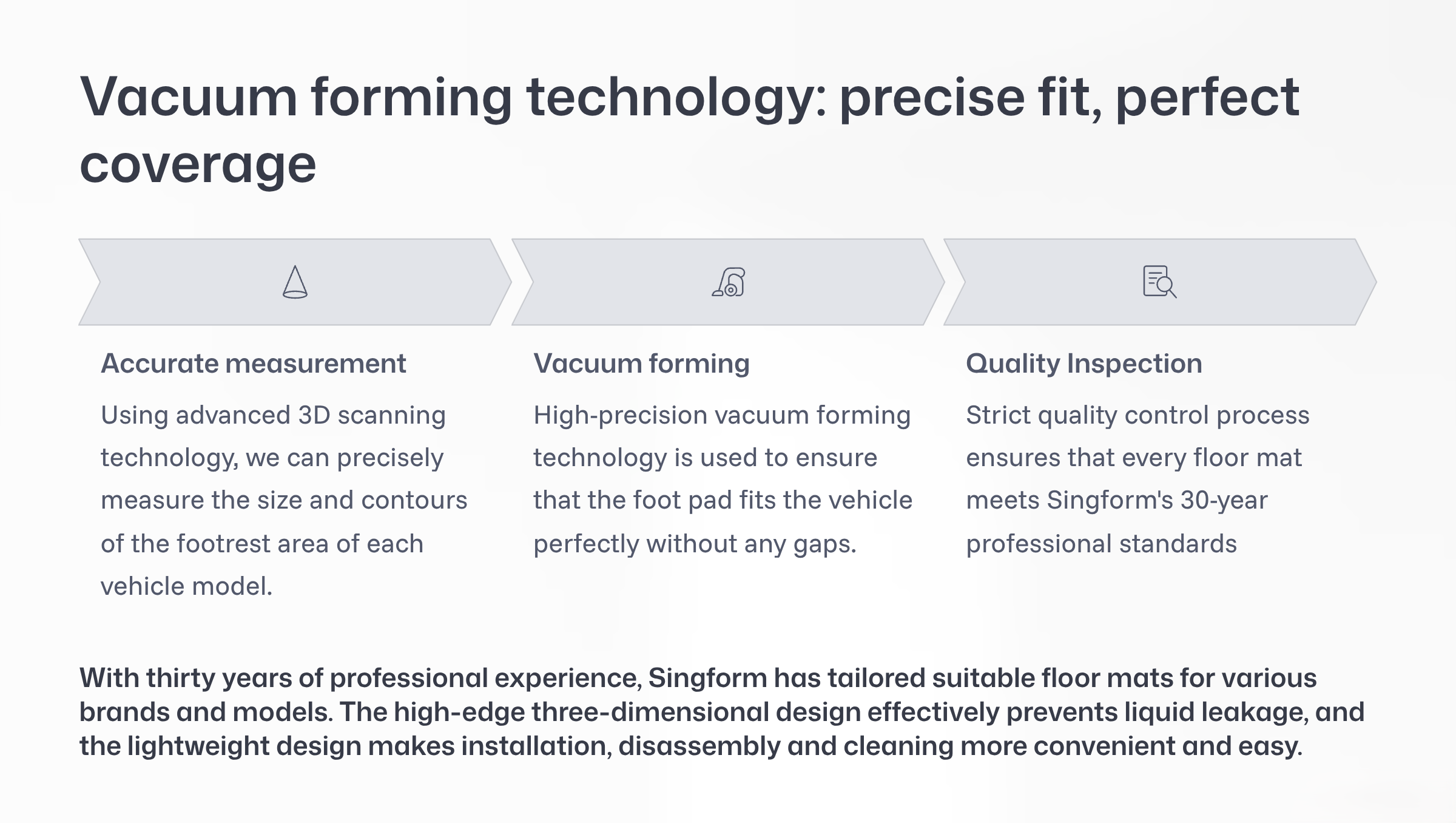 As a global supplier and manufacturer of floor mats, Singform specializes in producing customized, automotive-grade vacuum-formed mats designed to perfectly fit a wide range of vehicle brands and models.