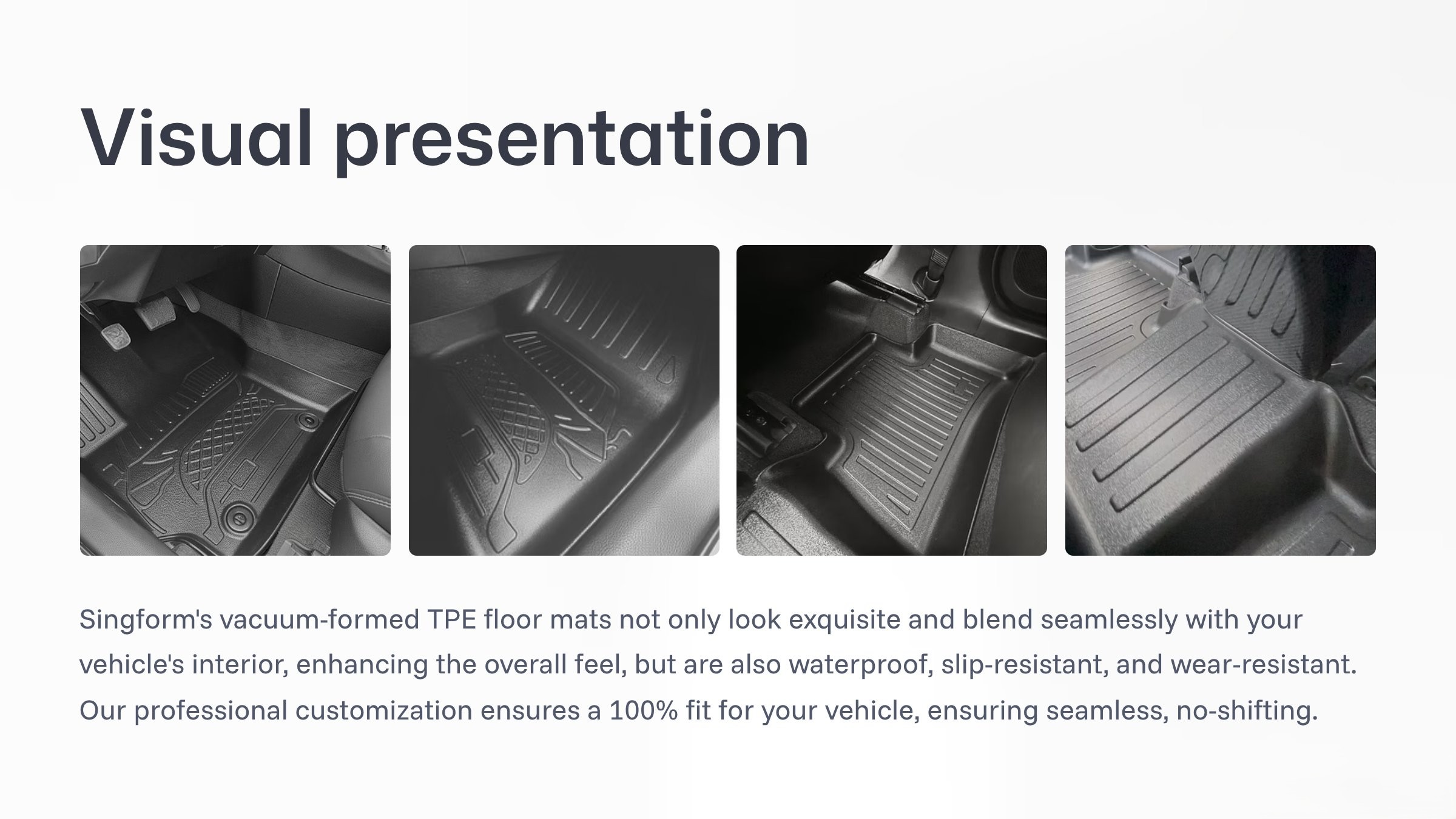 Singform Custom Vacuum-Formed TPE Car Floor Mats: Professional Quality, Perfect Fit With over 30 years of manufacturing expertise, Singform specializes in producing OEM-grade, custom-fit vacuum-formed car floor mats for brand partners and auto enthusiasts. Our TPE floor mats are engineered with a high-edge 3D raised design to prevent spills and debris from leaking into your vehicle’s interior. They are waterproof, anti-slip, wear-resistant, lightweight, and easy to install — making them the #1 choice for durable, all-weather car floor mats.