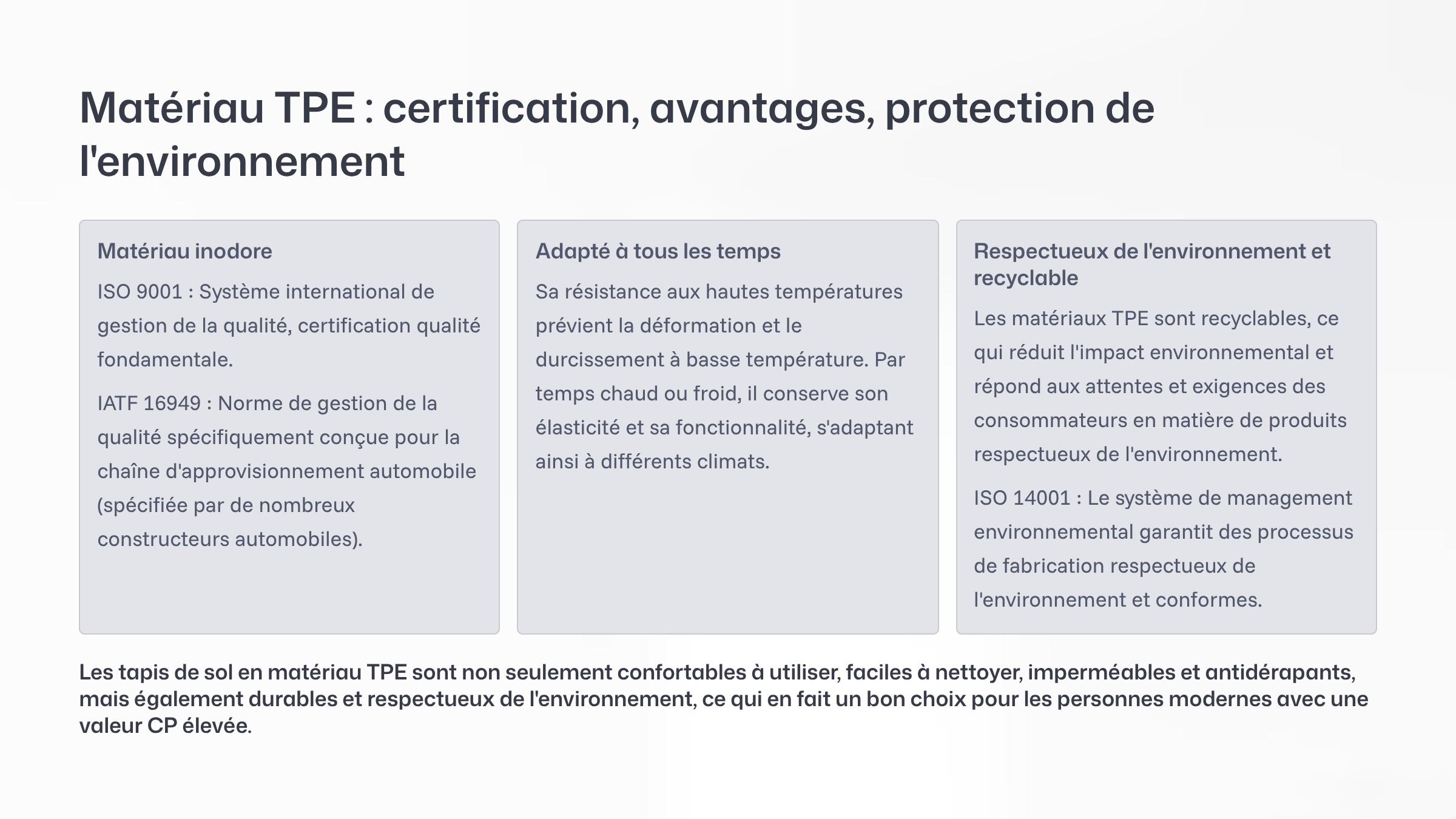 - Le matériau TPE est recyclable et réutilisable, réduisant l’impact environnemental et répondant aux attentes des consommateurs modernes pour des produits durables.