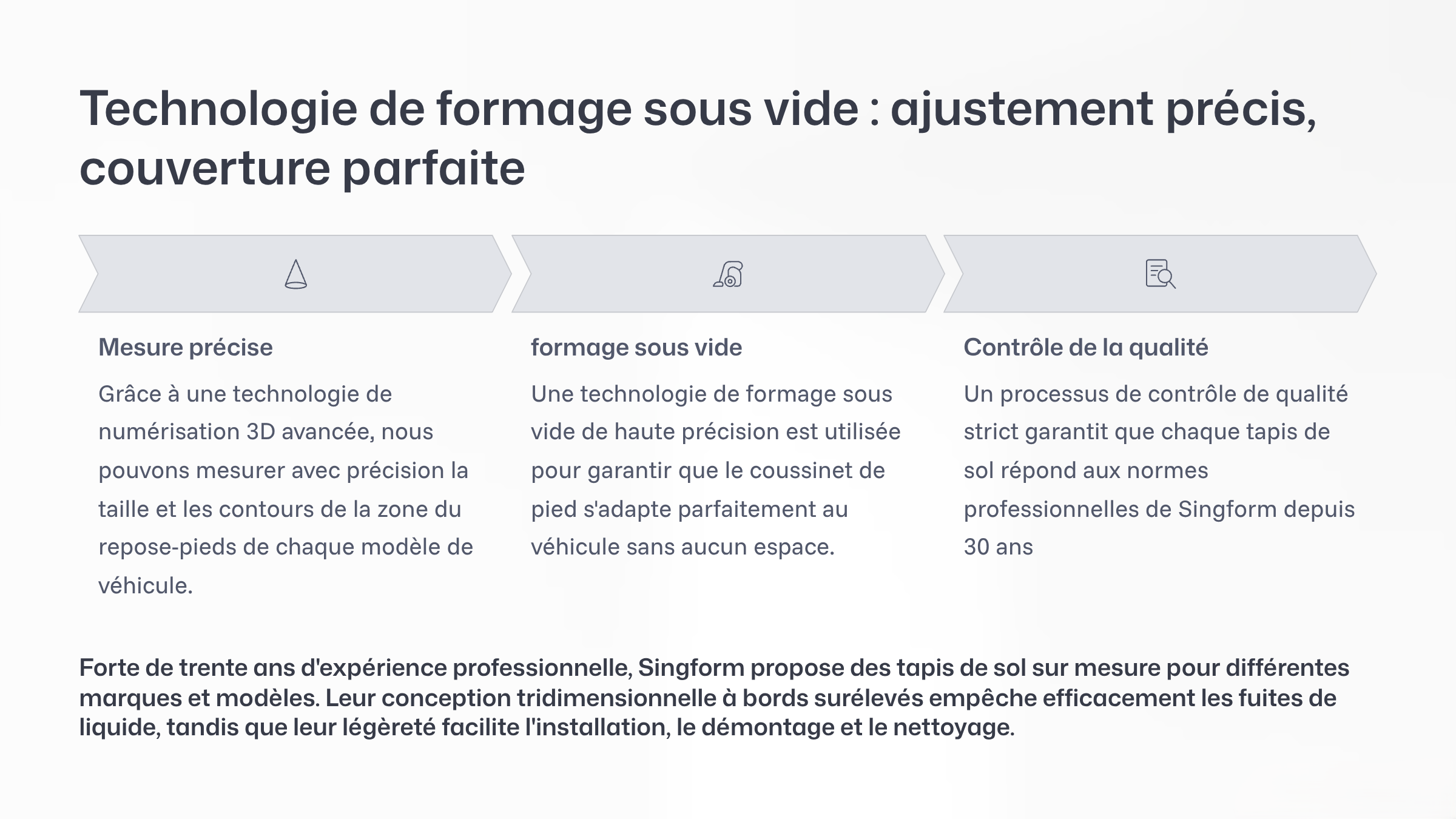 Singform Tapis de Voiture en TPE Thermoformé : Qualité Professionnelle, Ajustement Parfait Avec plus de 30 ans d’expérience dans la fabrication, Singform se spécialise dans la production de tapis de voiture thermoformés sur mesure, de qualité OEM, parfaitement adaptés à votre modèle de véhicule. Les tapis TPE Singform sont conçus avec un rebord 3D surélevé pour empêcher les liquides et la saleté de s’infiltrer dans l’habitacle. Ils sont étanches, antidérapants, résistants à l’usure, légers et faciles à installer — le choix numéro un pour des tapis de sol toutes saisons durables et élégants.