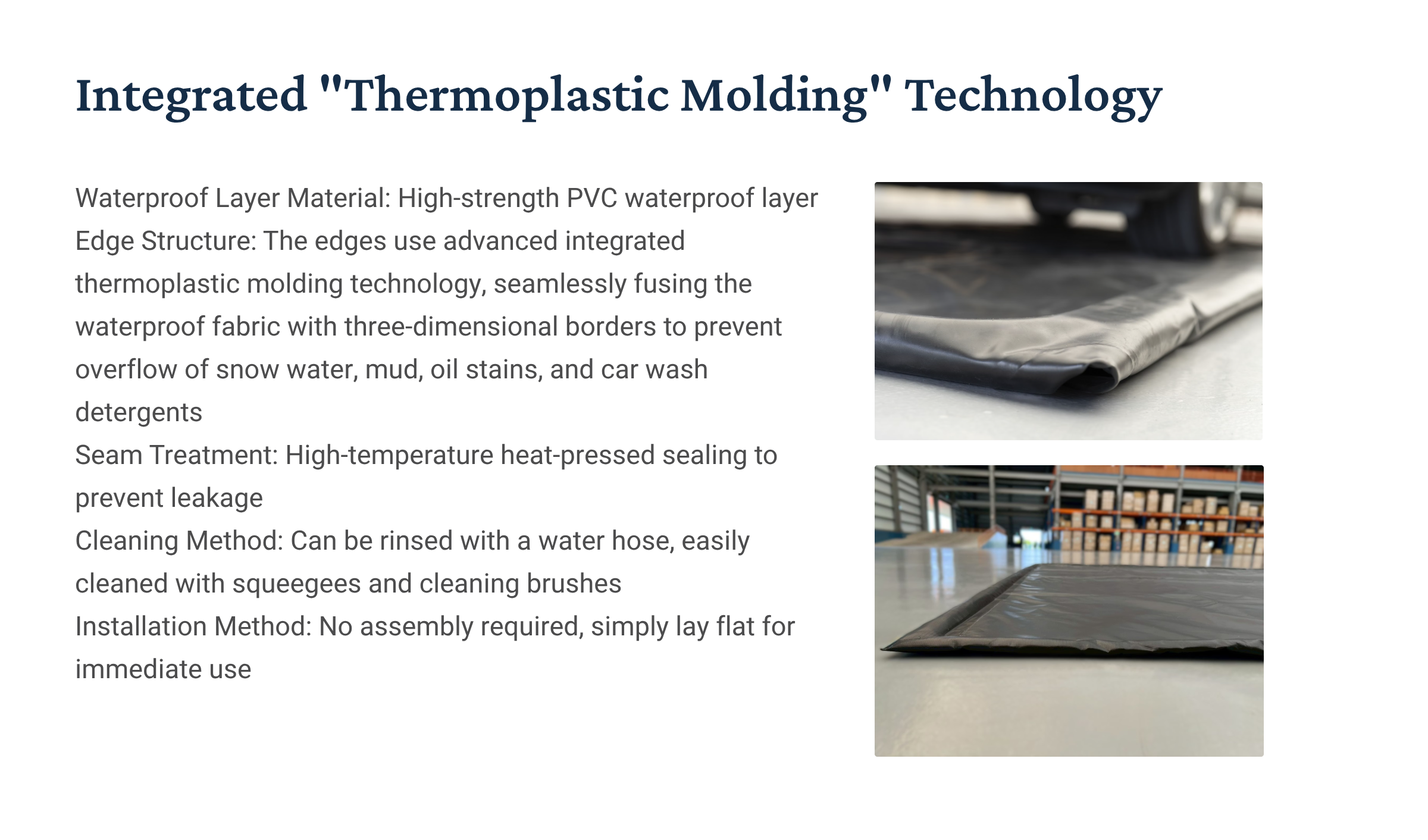 Waterproof Layer Material: High-strength PVC waterproof layerEdge Construction: The edges utilize an advanced, one-piece thermoplastic molding process, seamlessly integrating the waterproof fabric with the three-dimensional frame to prevent spillage from snow, mud, oil, and car wash detergent.