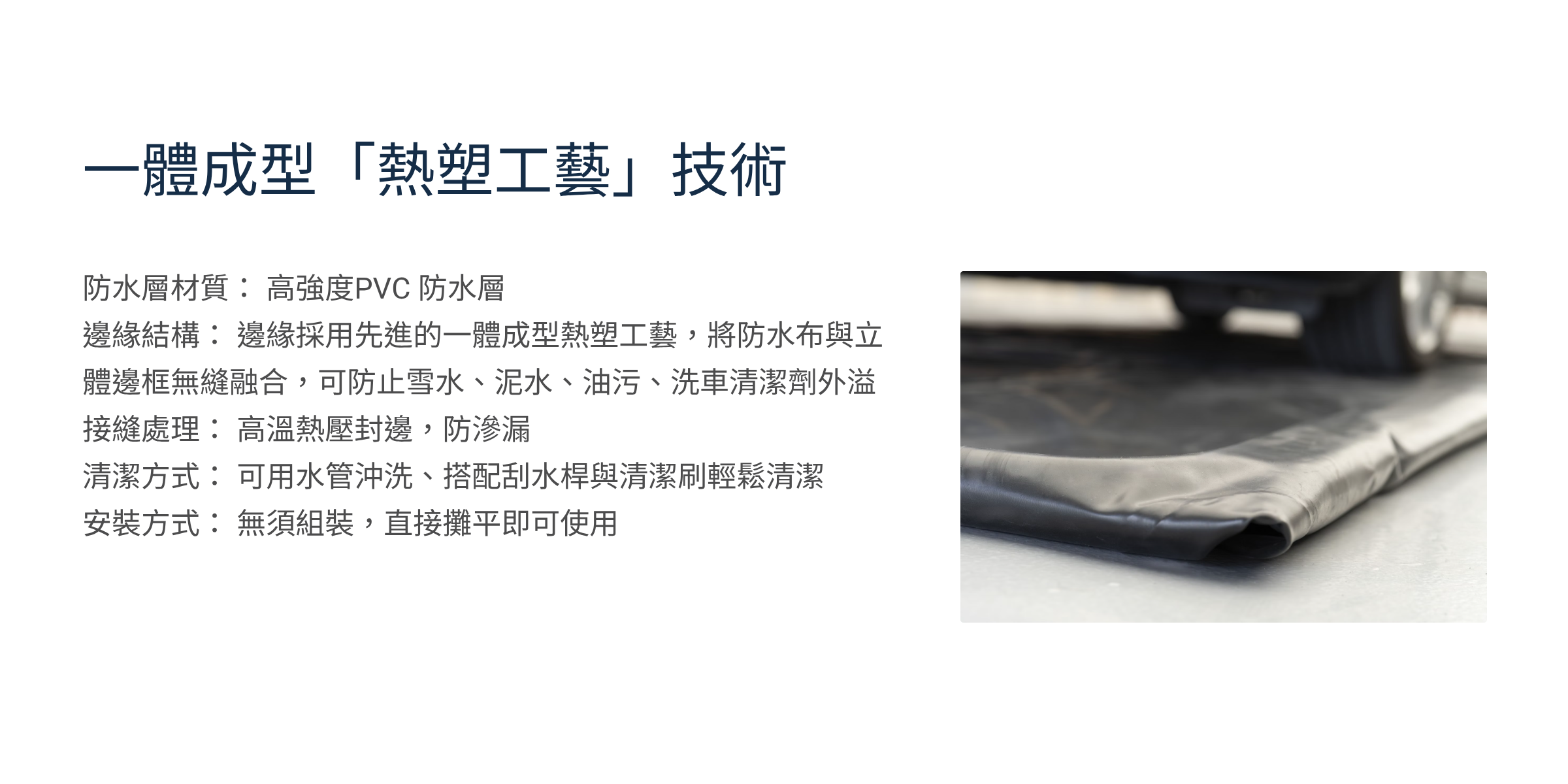 邊緣結構: 邊緣採用先進的一體成型熱塑工藝,將防水布與立體邊框無縫融合,可防止雪水、泥水、油污、洗車清潔劑外溢