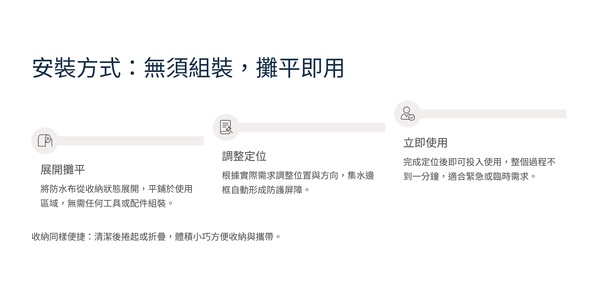 - 免安裝設計:攤開即可使用,無需固定或拼接。